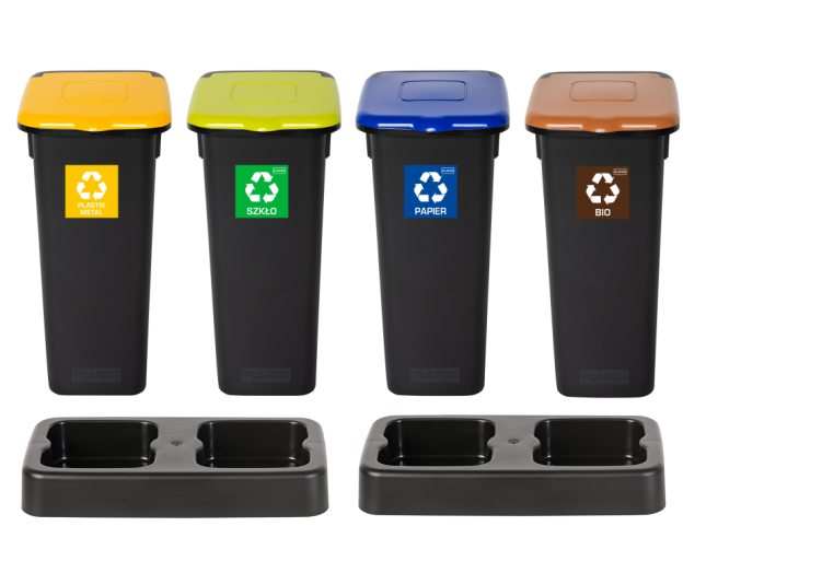Zestaw 4 Koszy do Segregacji 20l Plafor | Zielony, Żółty, Niebieski, Brązowy | Flap Bin + podstawa